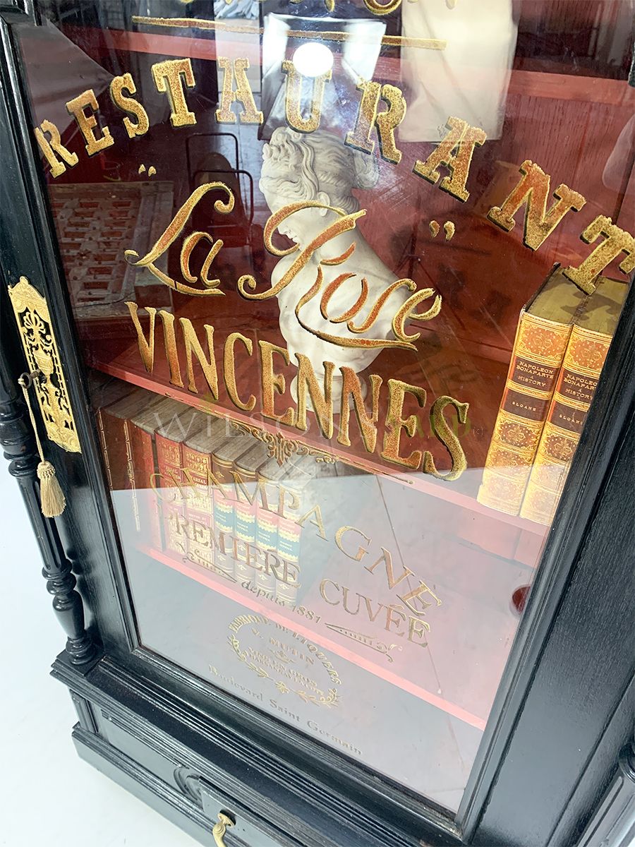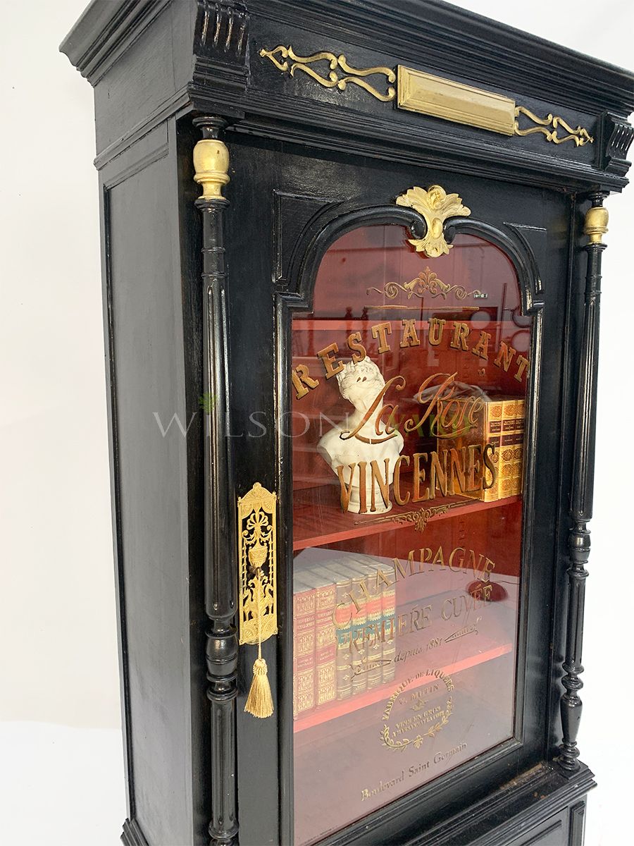 Antique French vitrine with sign writing door. 1 glazed door & 1 pull out drawer to the base, Inside is fitted with 3 wooden shelves, finished in a blue-black shade with brass embellishments.
