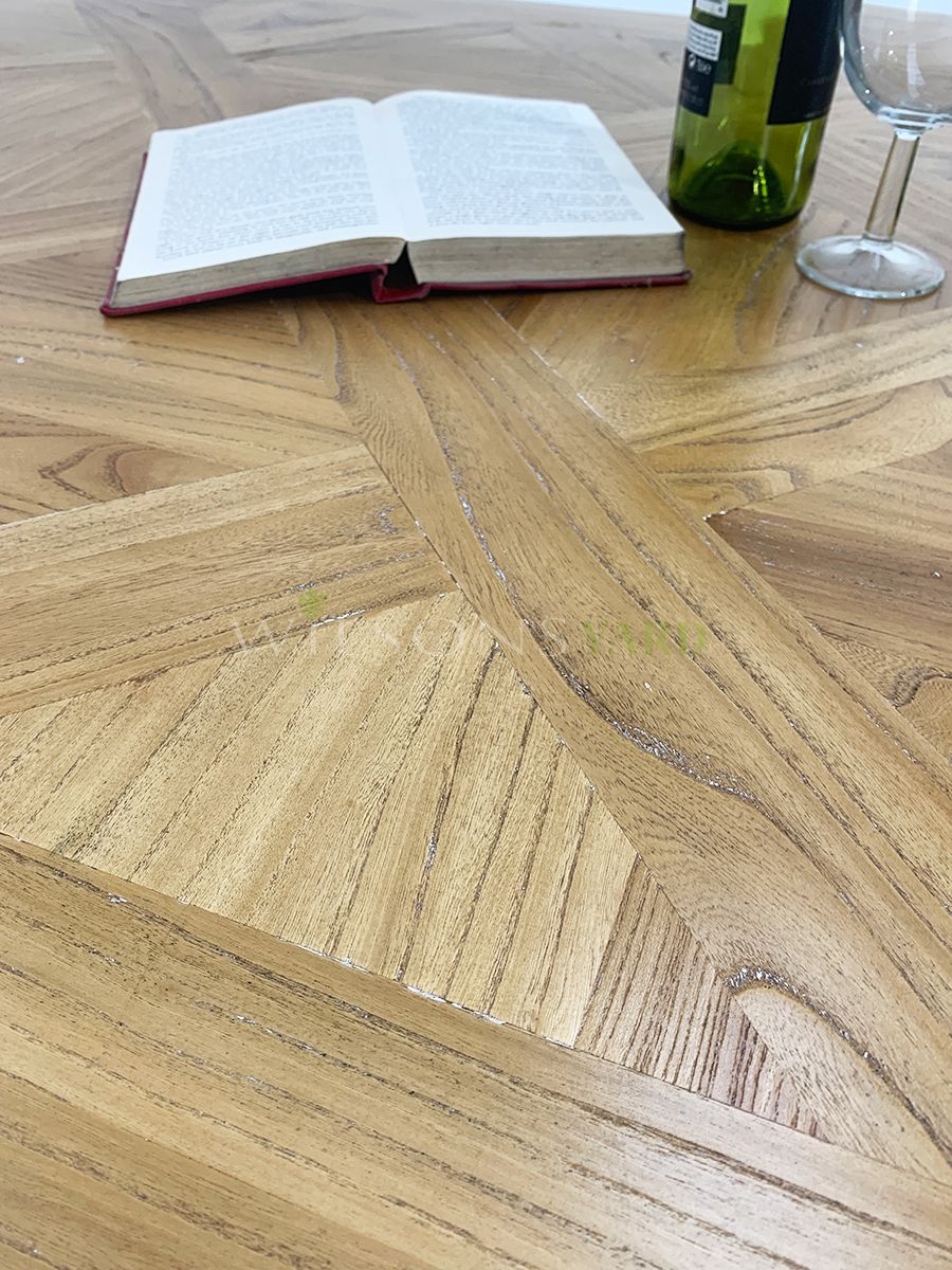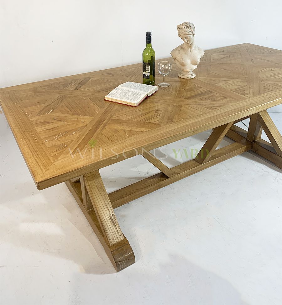 Beautiful x legged Elm parquet topped dining table in a natural finish.