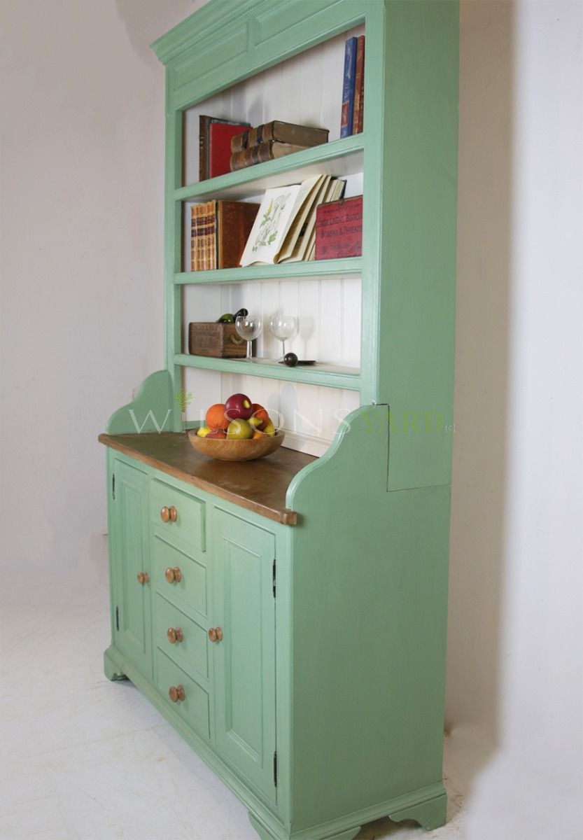 Beautiful green painted dresser with 3 shelves on top and 4 drawers, 2 cupboards below wooden round handles finished with cornicing to top