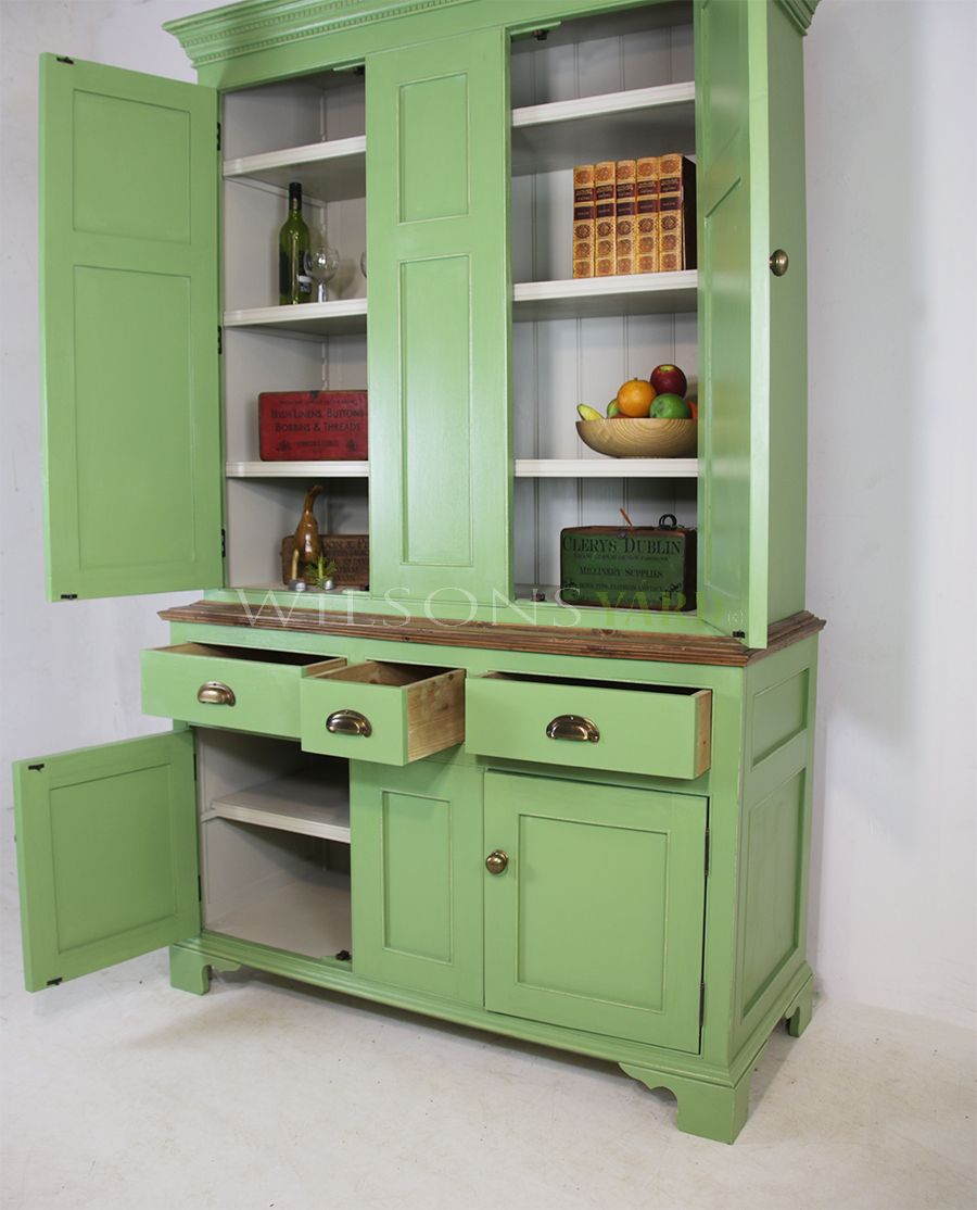 Beautiful painted vibrant green larder / dresser, consisting of 2 large cupboards with shelves to the top, and 2 cupboards and 3 drawers to the bottom. Finished with cornicing and brass embellishments.
