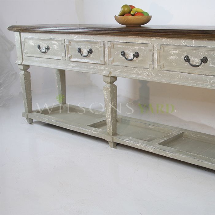 It has 4 large practical drawers with attractive detailing and forged steel drop handles.  The top is supported on five tapered, angular legs.   The base has been painted and is perfect for displaying pots, flowers or even linen