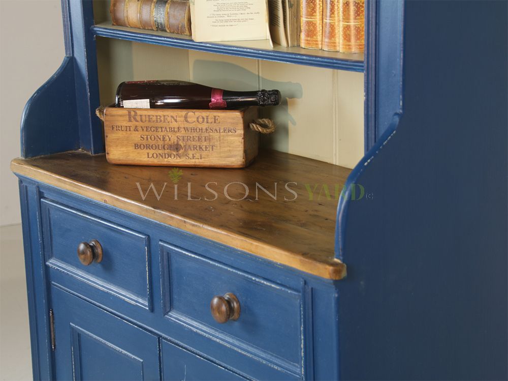 Beautiful blue painted small dresser with 3 top shelves, sitting on a reclaimed Pine top with 2 drawers and cupboard below.