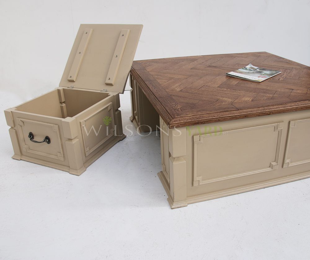 Made to order - Extra large coffee table, with 2 drawers and a pull-out foot stool. Table top is a rich dark oak parquet. The stool is ready to be covered in a cushion and fabric of your choice.