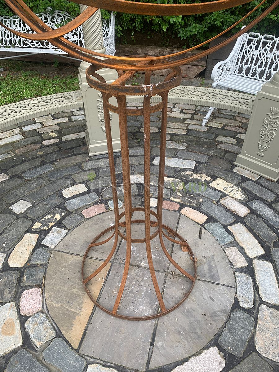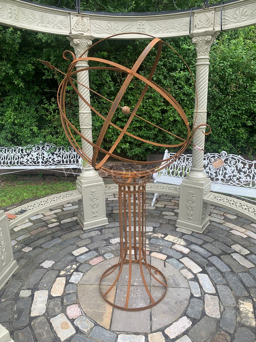 Blacksmith forged Armillary sphere garden sculpture, with enclosed smaller revolving sphere, on metal plinth.
