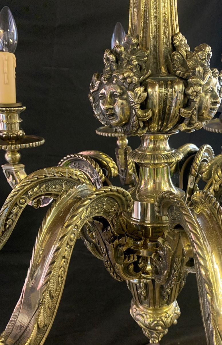 Decorative brass chandelier of superb quality with cherub detailing in the classical Empire style, supporting 8 candles.