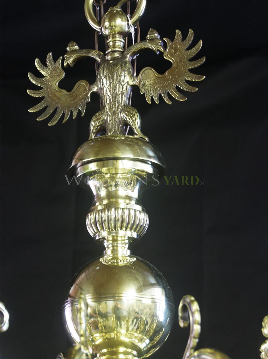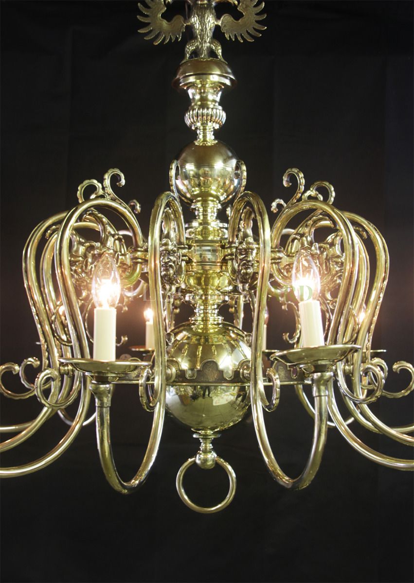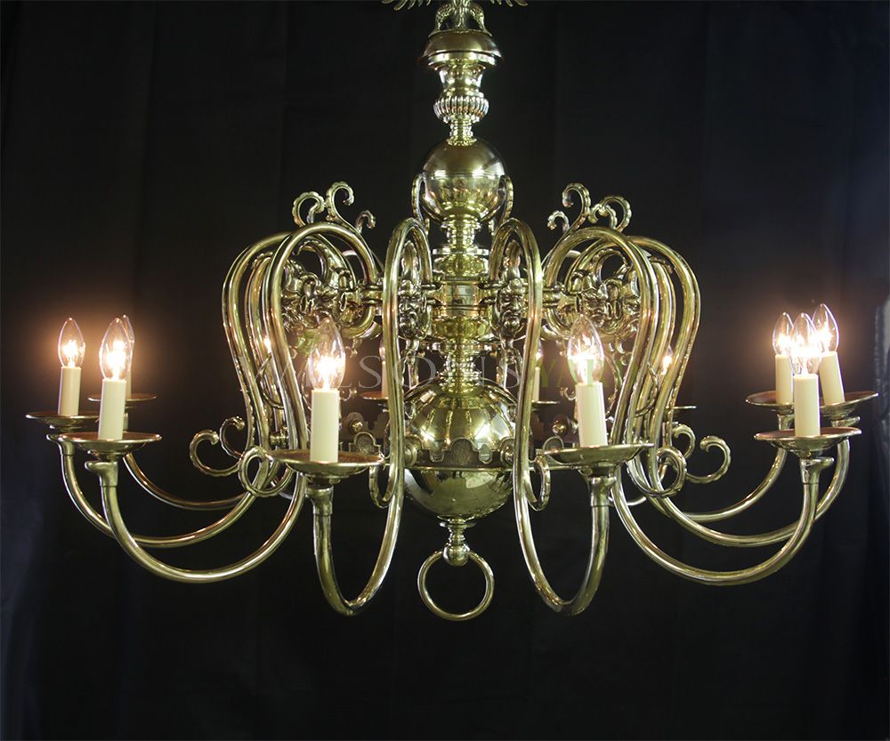 Spectacular vintage brass chandelier of large proportions supporting 12 candles on upswept arms