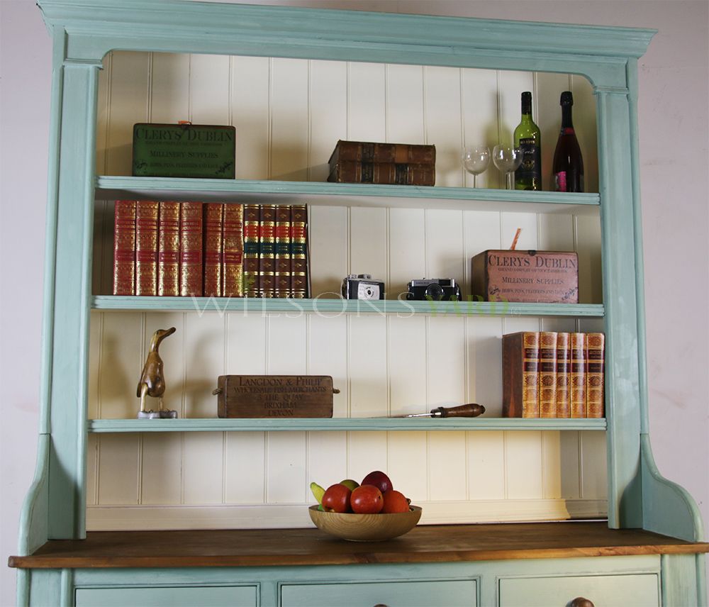 Painted F&B Green Blue dresser with 3 shelves, 3 drawers over 2 cupboards with wooden knobs. A reclaimed wooden work surface and a period style chicken coup centrepiece.