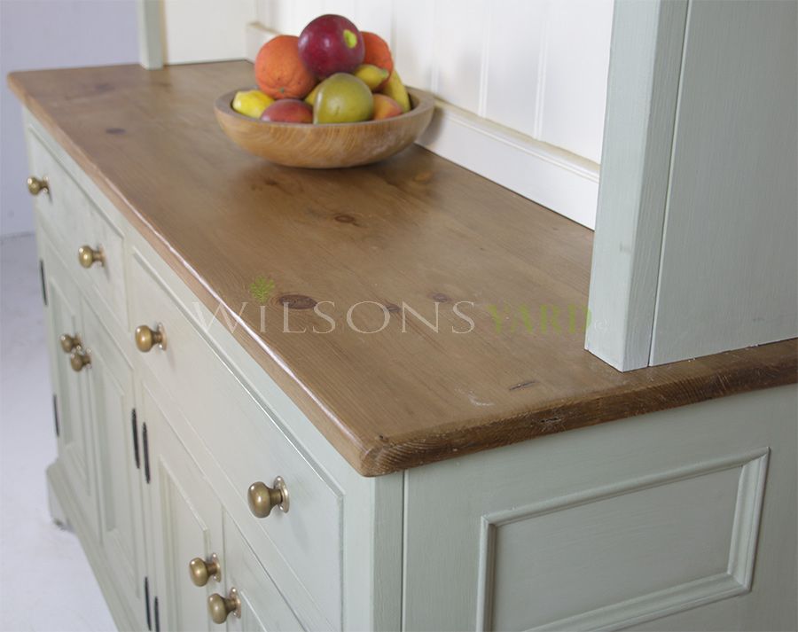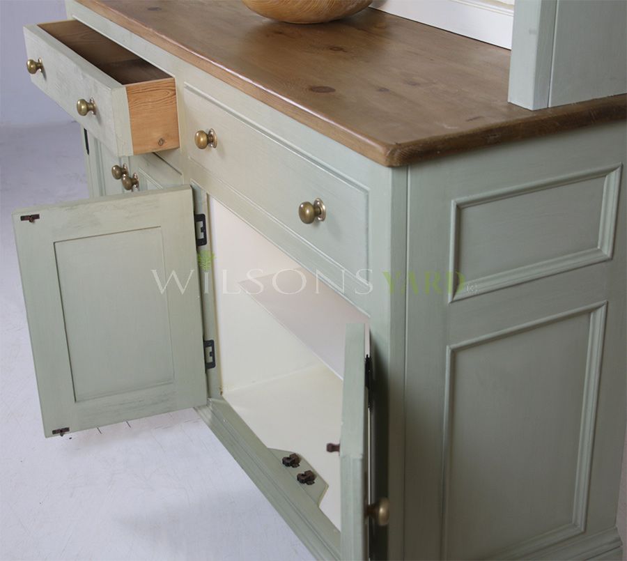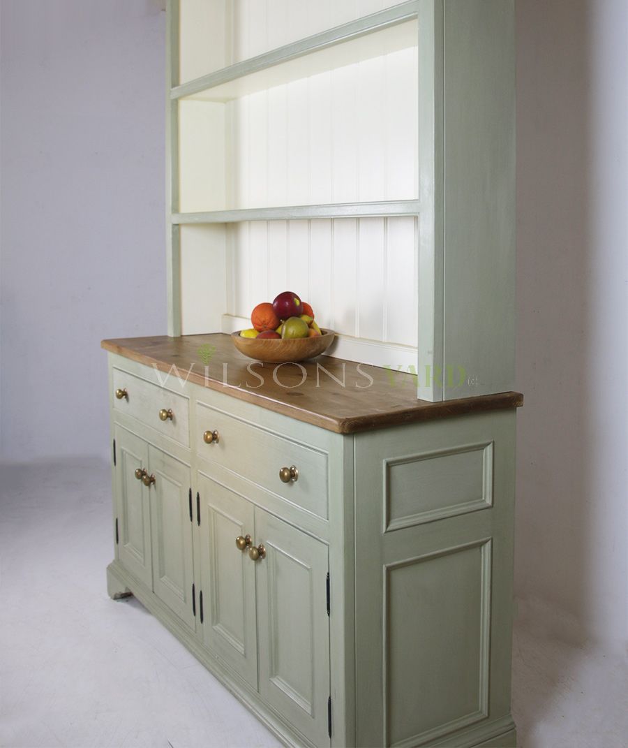 Green painted dresser comprising 2 shelves, 2 drawers and 2 cupboards fitted with brass handles