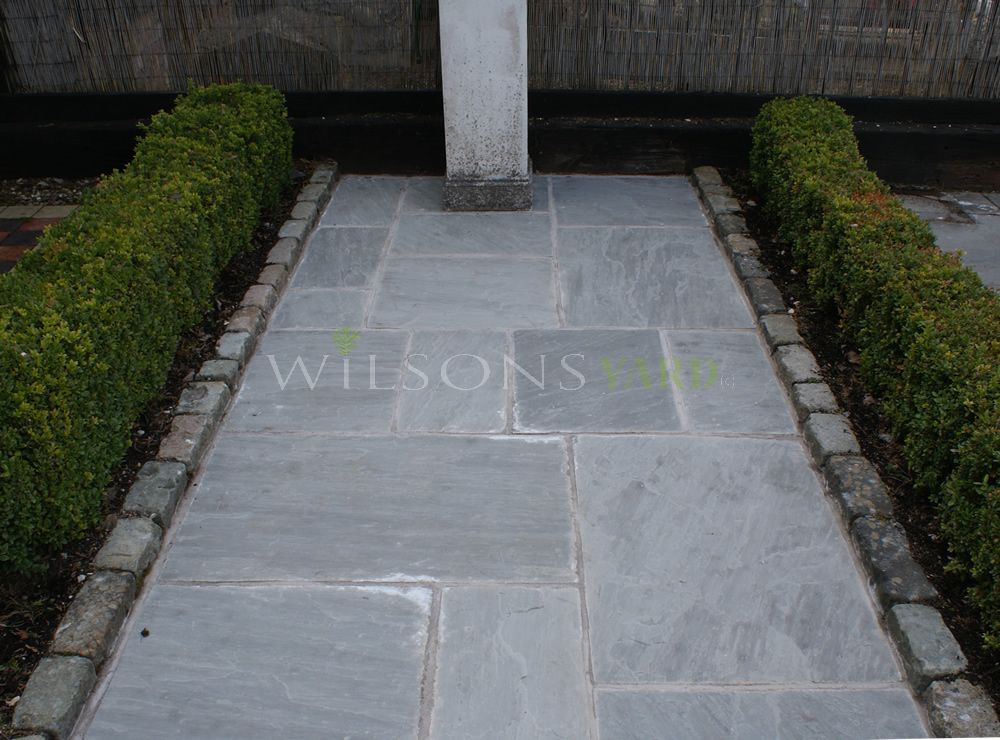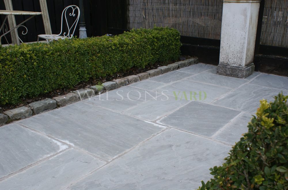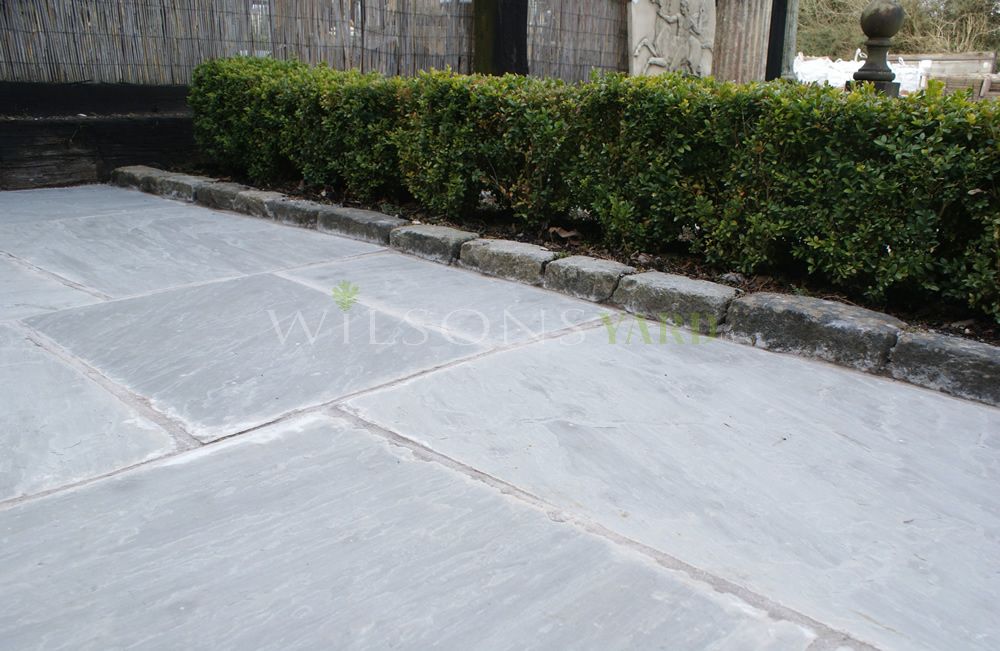 Greysham Sandstone Paving / Flags is supplied in a range of random sizes in a patio pack form. A box will typically weigh in the region of 700 kg (1,500 lbs) Note: Thickness or depth is approximately 22mm +/- 2 m