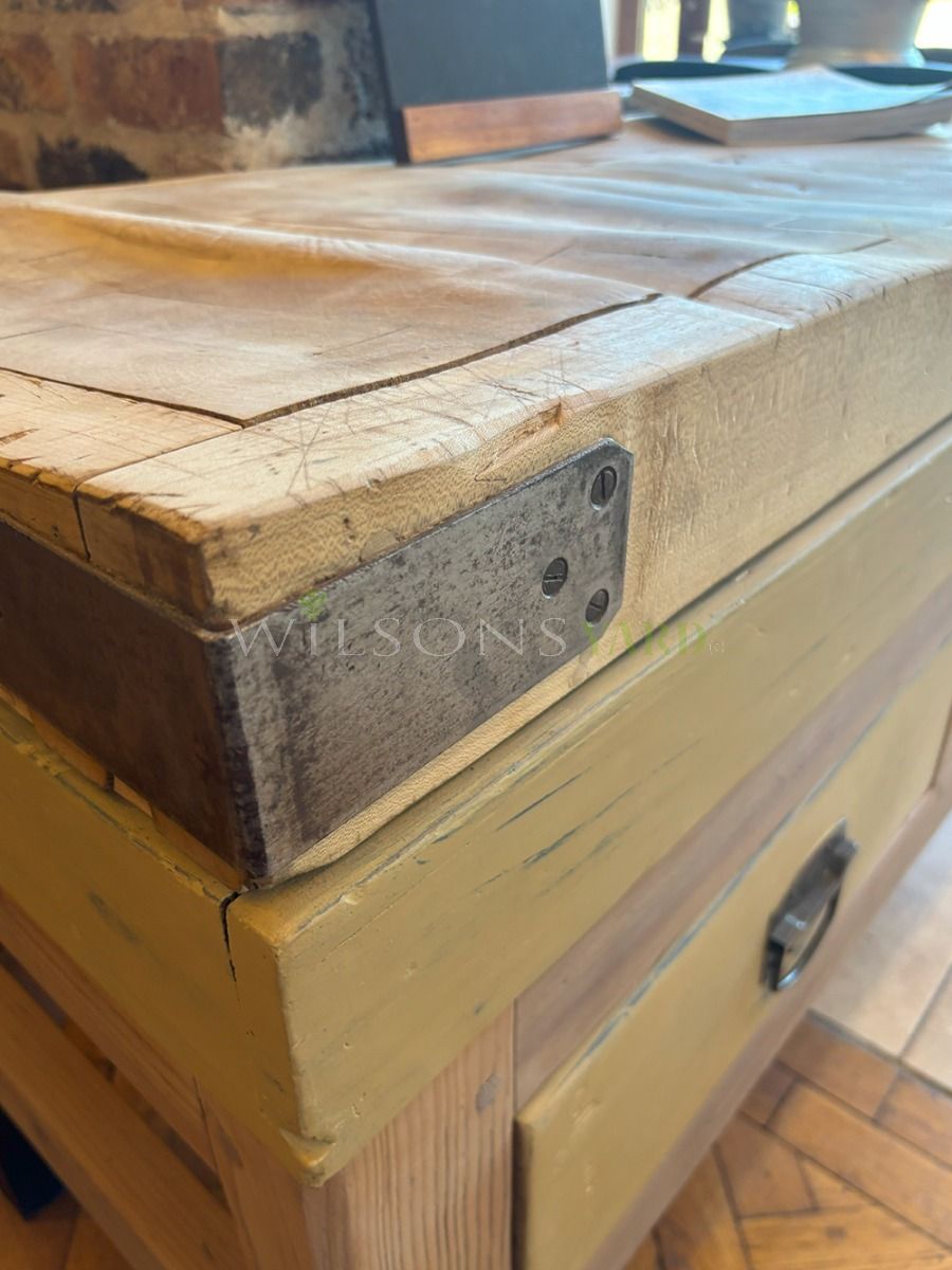 Fantastic 2 drawer antique butchers block of large proportions. Standing on raised metal legs, with pull out dovetail drawers finished in a distressed colour.