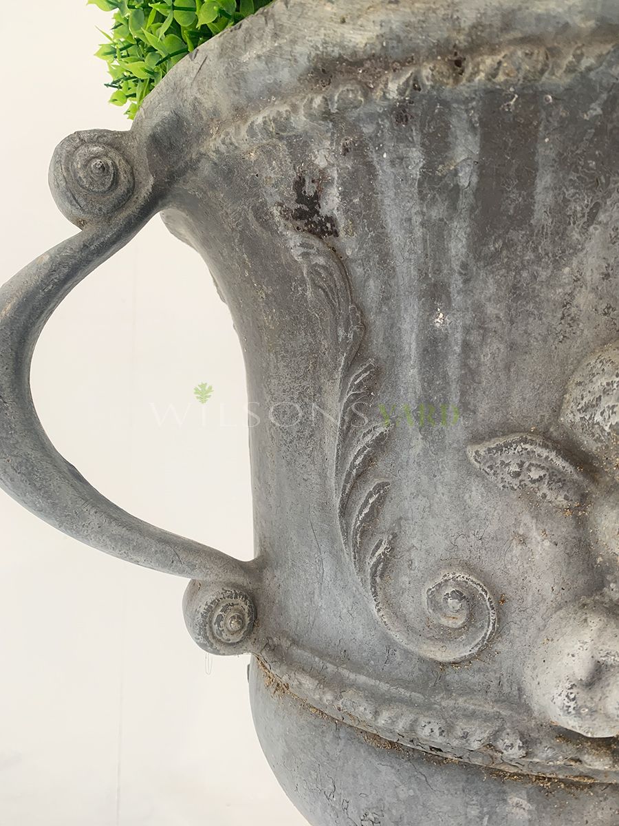 Splendid lead urn on base with beautiful cherub detailing. Superb piece