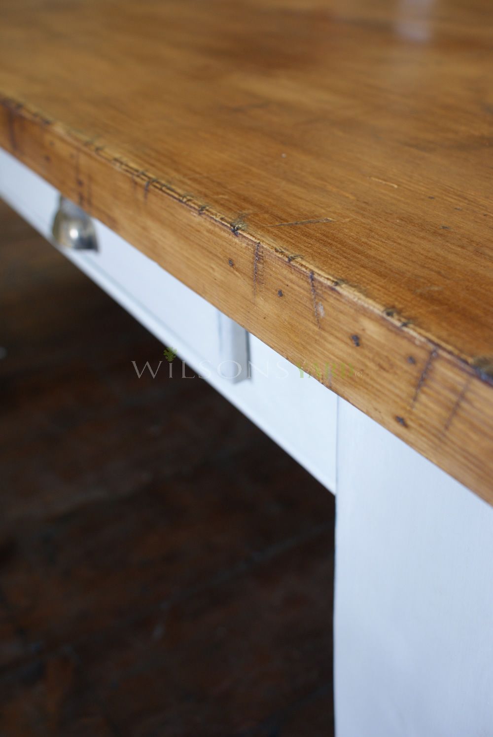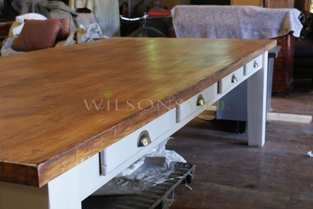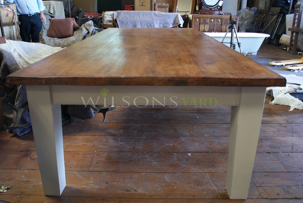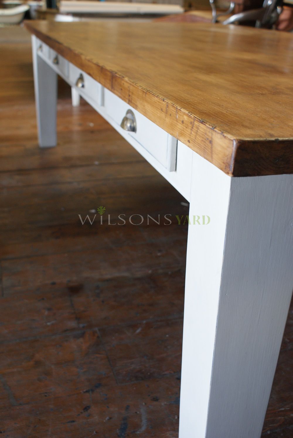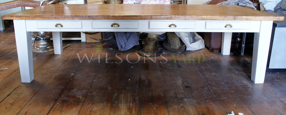 Very large kitchen / dining / banquet table. With a chunky reclaimed top and hand painted tapered legs.