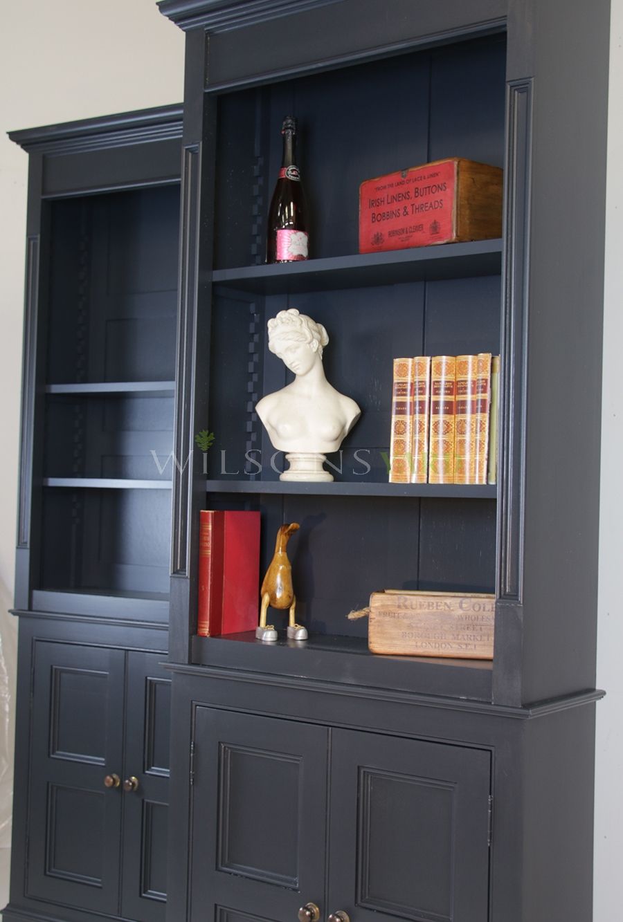 Pair of petite stylish bookcases an elegant design with adjustable shelves and cupboard storage below. Hand painted in a farrow and ball shade