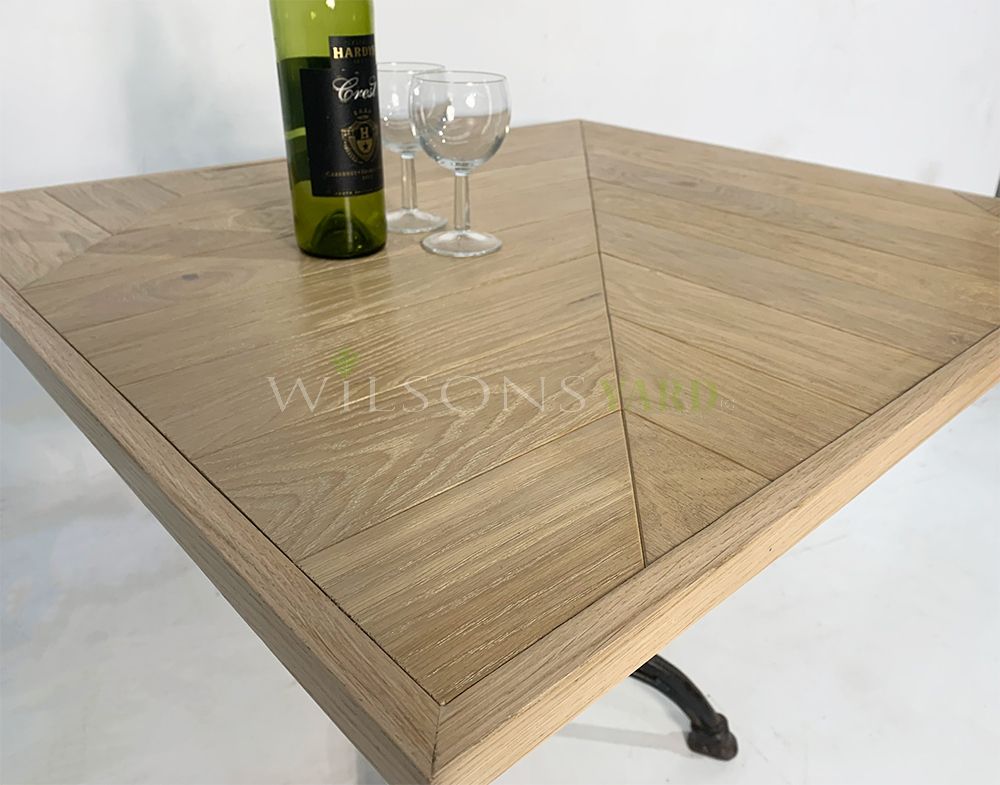 Small parquet topped table with industrial metal legs. Ideal for a restaurant / café or home use.