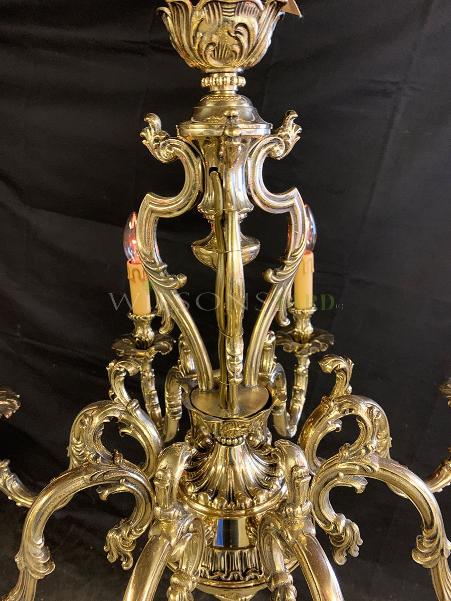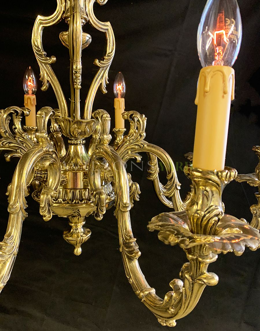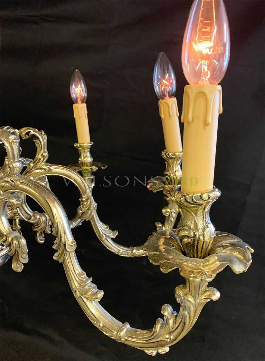 Beautiful restored 8 arm French foliate chandelier cast in Bronze, supporting 8 no candle bulbs, on upswept arms.