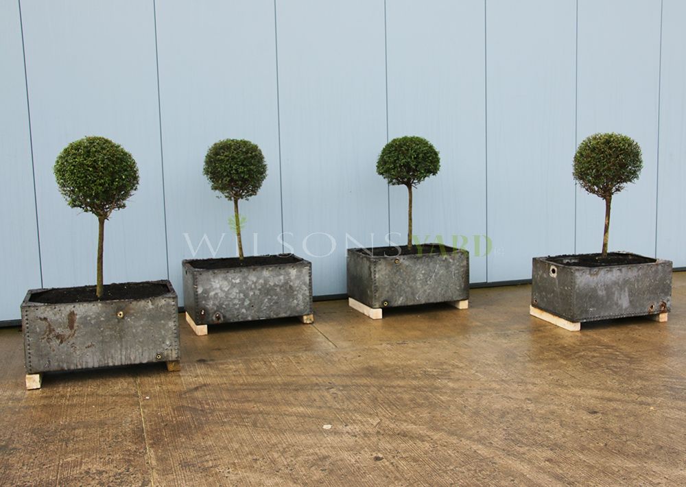 Matching set of 4 no stylish riveted industrial architectural planters, repurposed from 4 no 1930s water tanks