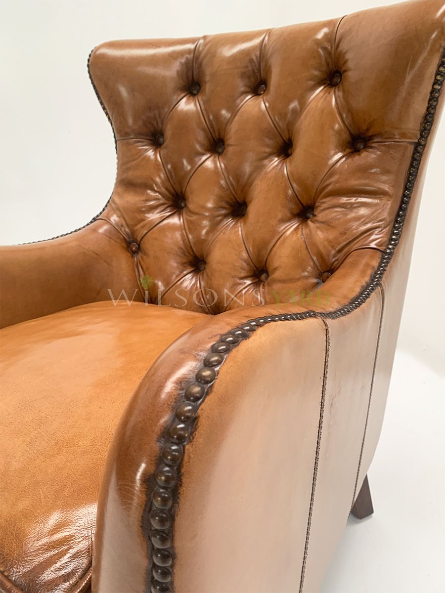 Period style button back armchairs in the finest quality leather complete with brass studding and brass castor wheels
