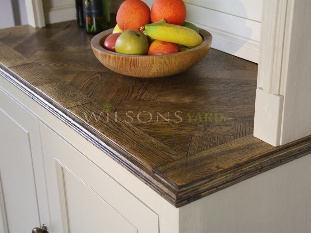 With a reclaimed parquet top over a double cupboard and standing on elegand shaped feet