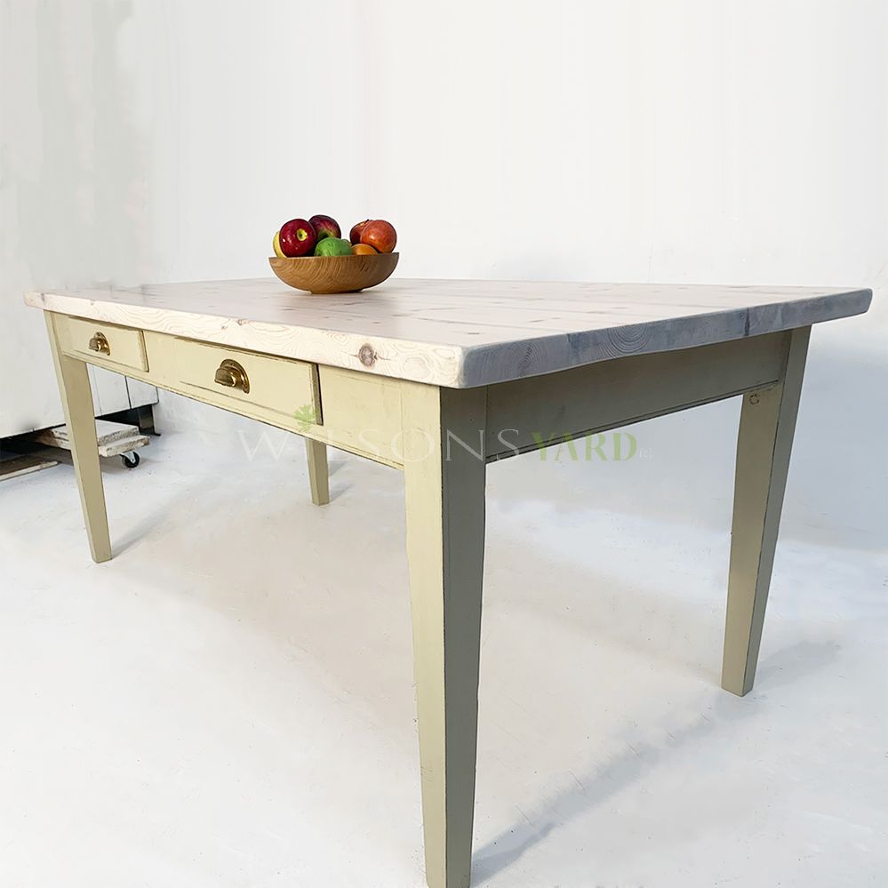 Tapered leg kitchen table, painted in a soft green tone with 2 drawers to each side with brass cup handles. The top is reclaimed pine with a limed look finish.