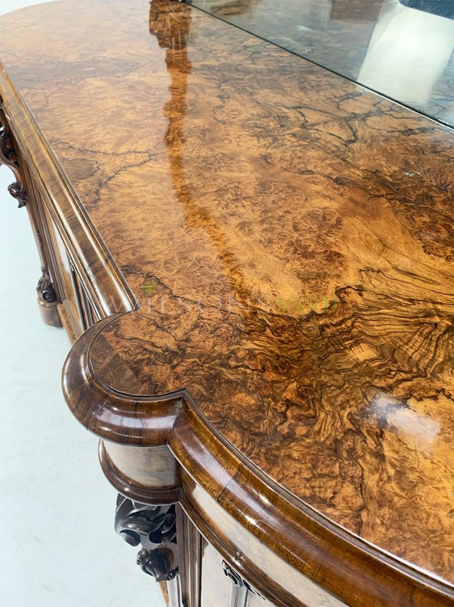 A Stunning Victorian mirror backed sideboard / credenza in Burr Walnut, beautifully shaped corners with bow fronted cupboard doors.