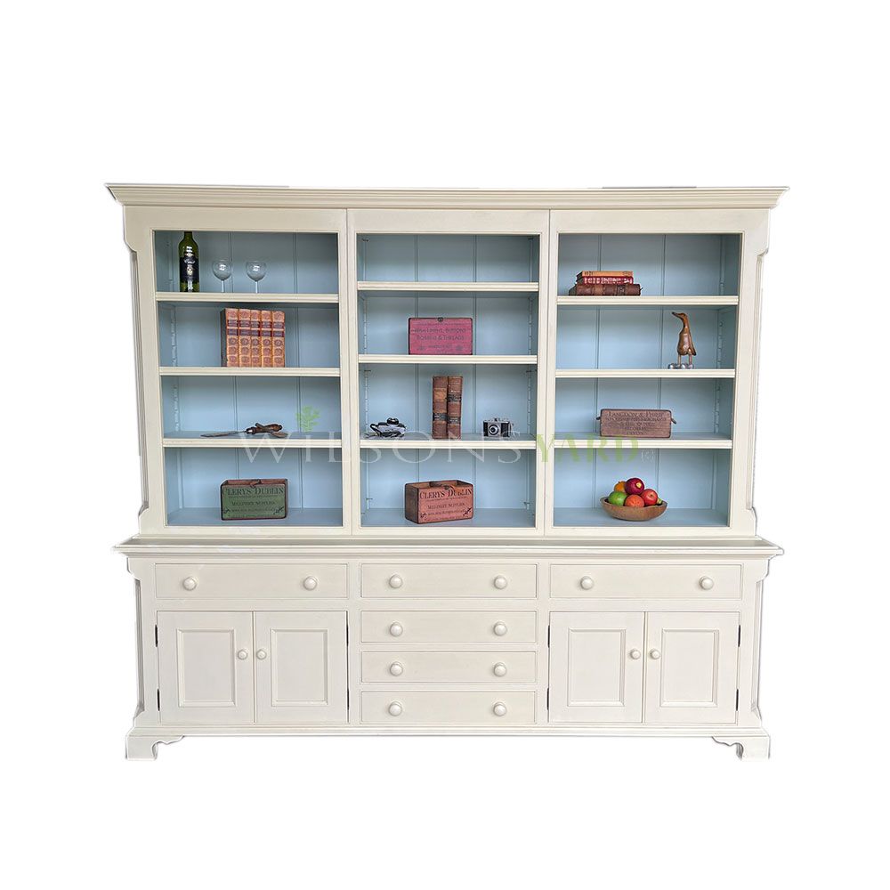 Large hand painted dresser with canted and fluted corners. Standing on bracket feet, with double cupboard & drawer above on each side & 4 drawers in the centre.